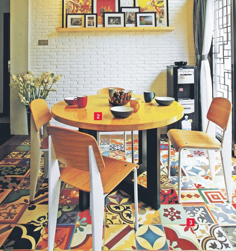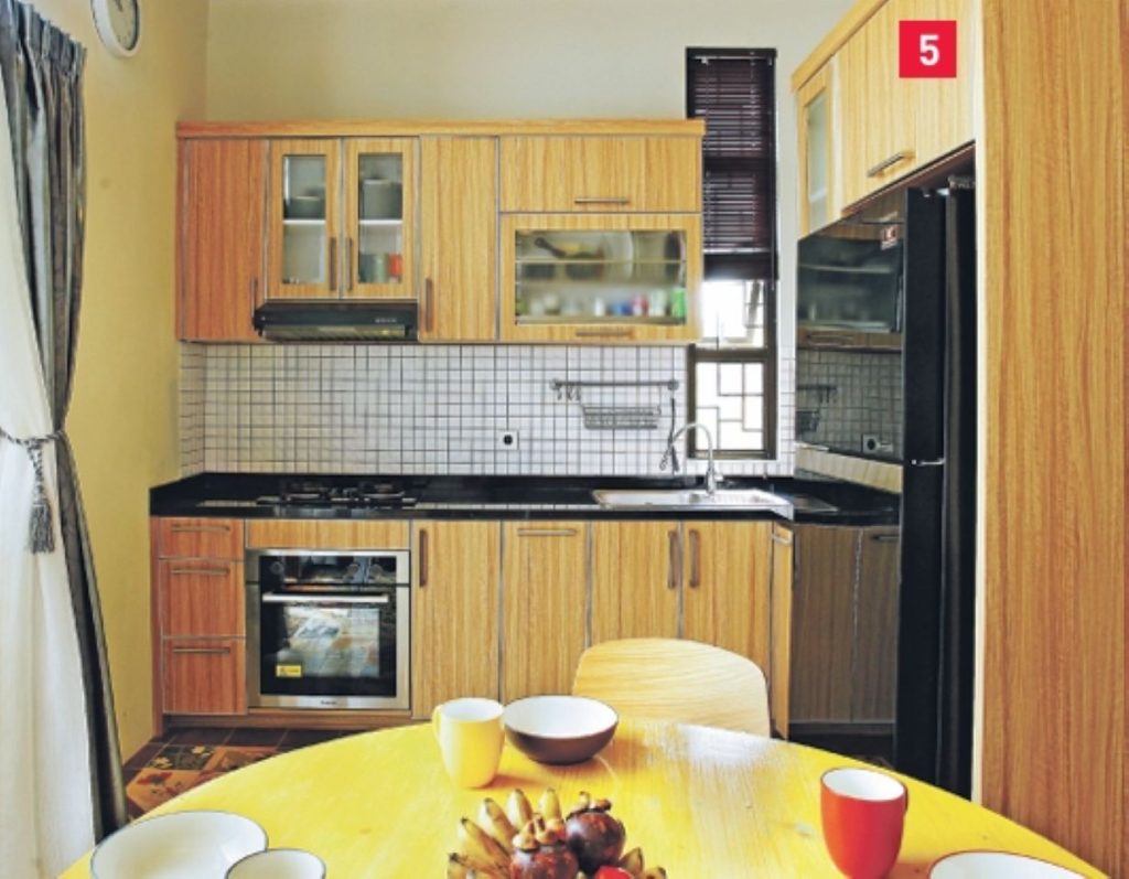 Khusus untuk area makan, ubin tegel merek Kunci yang digunakan sebagai lantai. “Supaya cocok dengan suasana santai yang kami ingin ciptakan. Sesuai juga dengan meja kayu bulat bergaya country ini,” ujar Indri sambil menunjuk meja bulat kuning yang ada di ruang itu.