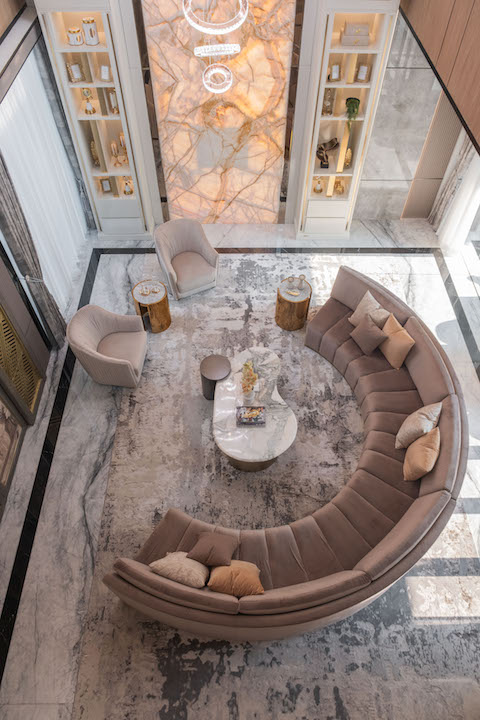Wall treatment dari Onyx menjadi elemen dekoratif sekaligus fungsional, melengkapi ruang keluarga ini. Diapit 2 storage berupa lemari tinggi menjulang yang didesain sangat estetis, area ini menjadi bagian yang sangat menarik di rumah singgah ini.