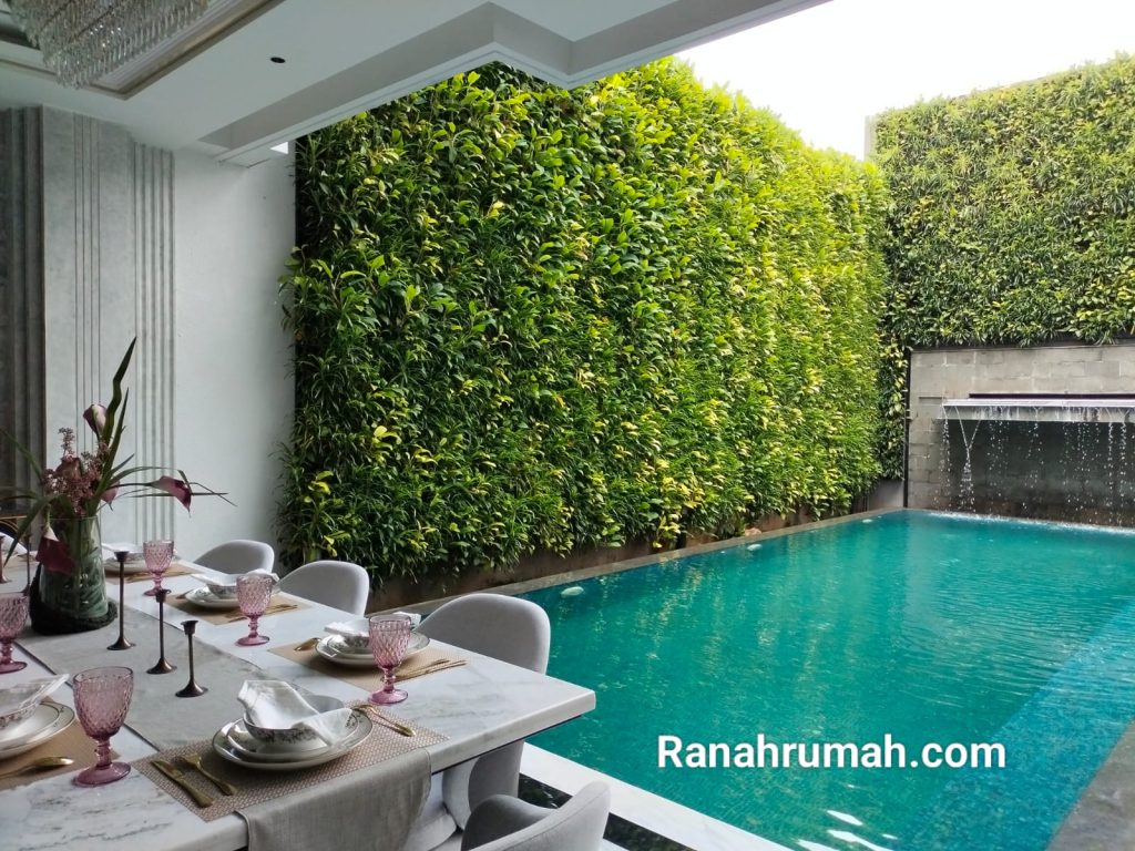 Berada di area Void rumah, sirkulasi udara dan pencahayaan lebih dari cukup. Salah satunya, juga berasal dari area outdoor di sebelahnya, yang digunakan sebagai kolam renang yang dikelilingi tanaman dinding hijau segar. Di bagian selasar area kolam renang, menempati bagian beratap, meja makan diletakkan di sini. “Jadi ruang santai keluarga yang nyaman ini, dan mengakomodasi keperluan lain saat digunakan untuk acara lain,” tambah Idfa.