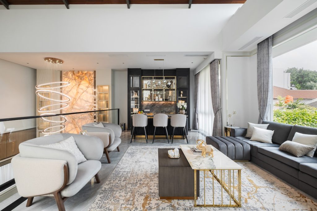 Living Room menjadi ruang utama yang didesain khusus untuk mengakomodasi kebutuhan aktivitas pemilik rumah. Menyambung dengan ruang tamu, ruang keluarga ini dipisahkan dengan panel dinding estetik yang sesungguhnya adalah pintu penghubung. “Pintu ini didesain fleksibel, dapat dibuka secara penuh saat diperlukan untuk menghasilkan perluasan ruang keluarga,” jelas Idfa.