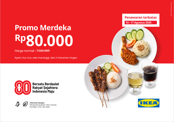 Tak hanya produk rumah tangga, pengunjung juga diajak merayakan kemerdekaan melalui cita rasa Nusantara. Mulai 14 hingga 18 Agustus, IKEA menyajikan paket kuliner khas bertajuk “Promo Merdeka” yang terdiri dari Ayam Rica-Rica, Sate Maranggi, dan dua minuman ringan seharga Rp80.000 (harga normal Rp109.000).