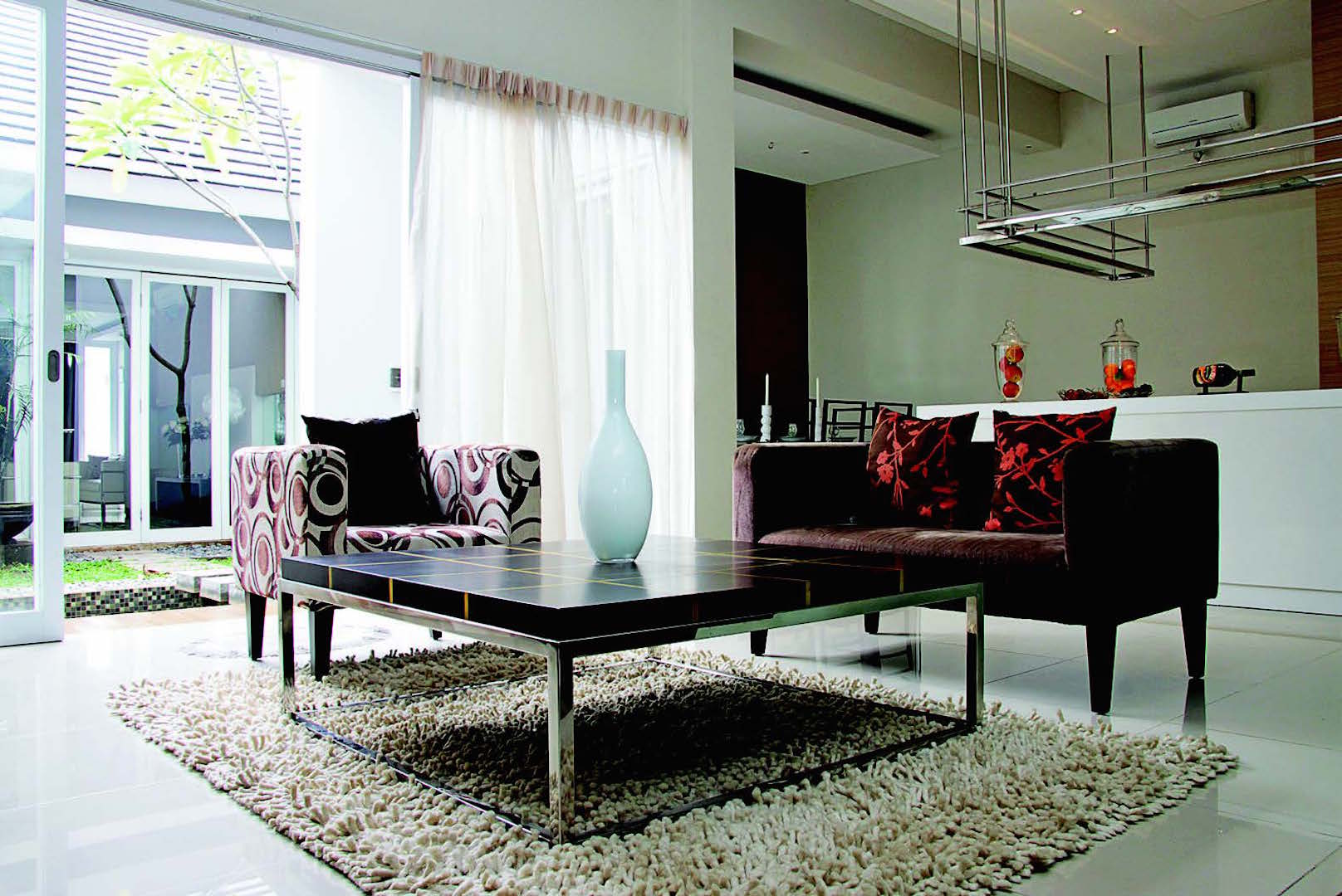 Pada ruang keluarga ini, warna putihlah yang digunakan sebagai pengikat. Ia diaplikasikan pada warna dinding, kusen, lantai, dan center piece pada coffee table di tengah ruang.