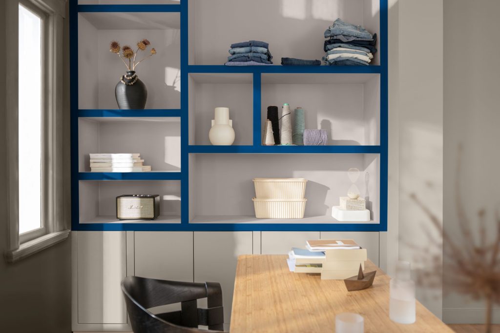 Biru Free Groove™ juga mudah dipadukan dengan warna aksen hangat, material alami, atau elemen grafis yang berani.