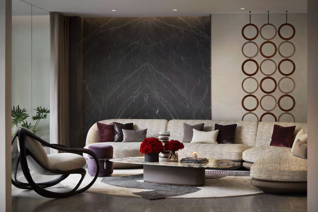 Di area Living lainnya, ruang lounge dilengkapi dengan sofa Soho dari Carlo Colombo, yang menonjolkan kenyamanan kontemporer. Meja kopi Griffe dan cermin Rift, keduanya dirancang oleh Giorgetti R&D dan Giancarlo Bosio, memperkenalkan kerajinan tangan Italia yang modern dalam suasana yang harmonis dan menawan.