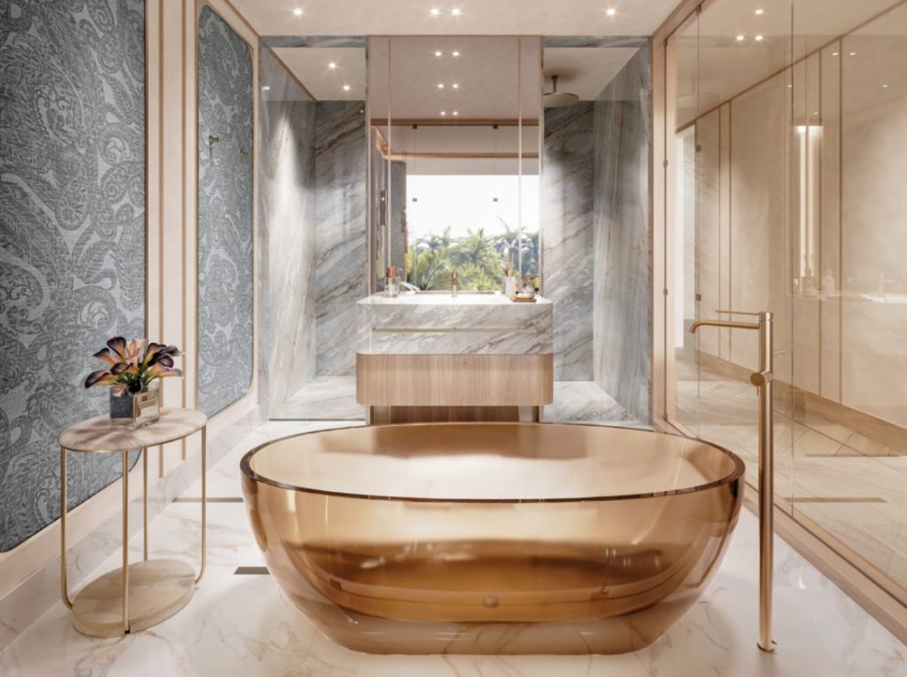 Kamar mandi utama, tempat keahlian Italia berpadu dengan material ekspresif dan detail yang dirancang khusus di seluruh bagiannya.