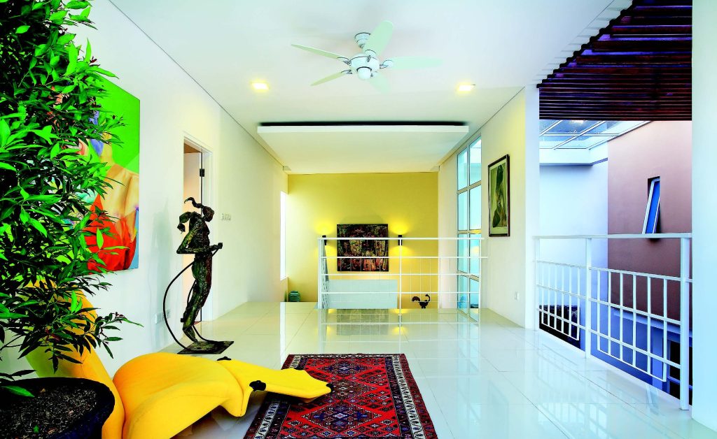 Panel dinding berwarna merah teraplikasi dengan cantik. Di samping sebagai jeda di tengah ruang-ruang yang dominan warna putih, warna merah dipercaya mampu memengaruhi nafsu makan seseorang. Selain itu lemari untuk penyimpanan diletakkan di jembatan courtyard.