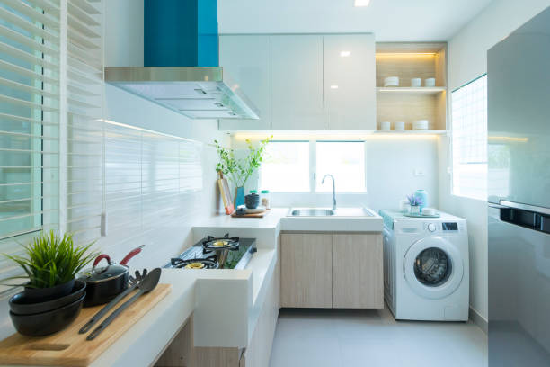 Peranti kerja dan aktivitas tersebut di atas tentunya memerlukan tempat. Perhitungkan posisinya agar peranti kerja tersebut mengalir sesuai alur kerja di dapur. Misalnya mesin cuci, pikirkan sejak awal, apakah akan disembunyikan di dalam kabinet atau dibiarkan terekspos saja.