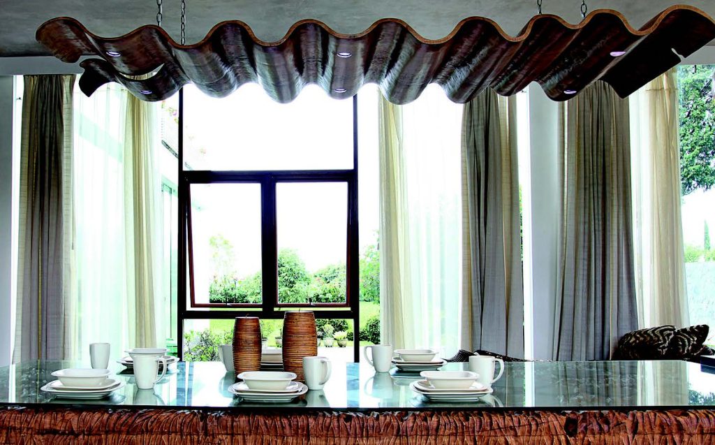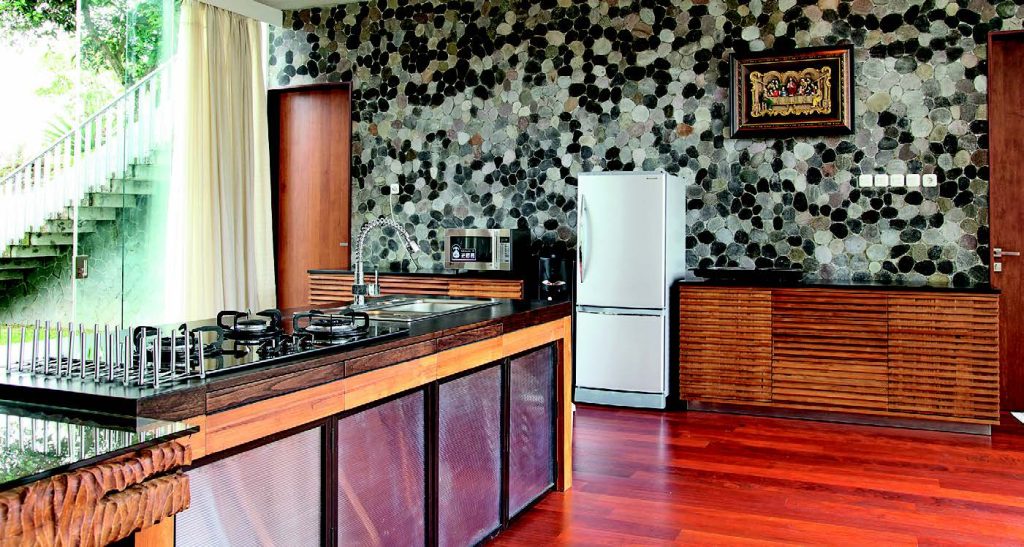 Masih menggunakan bahan-bahan alami, salah satu bidang dinding ruang makan ini dilapisi batu. Batu kali ini asalnya dari Tawangmangu, Jawa Tengah, yang dipotong dengan ukuran yang bervariasi.