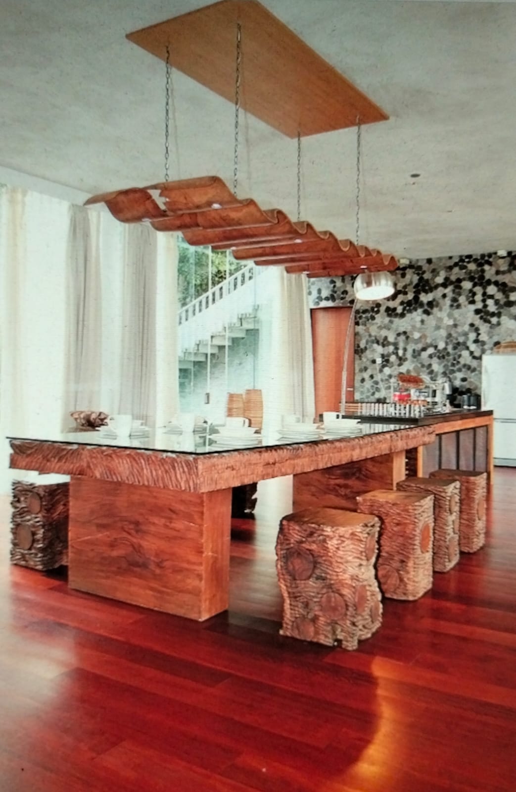 Kayu yang digunakan adalah kayu gelondongan alias berupa kayu batangan yang utuh. Meja makannya terbuat dari kayu jati. Sedangkan kursinya dari kayu trembesi. Kayu-kayu ini sengaja dibuat bertekstur kasar sehingga terlihat rastik.