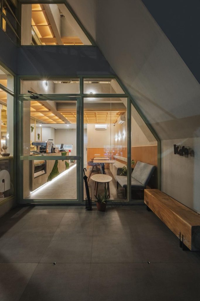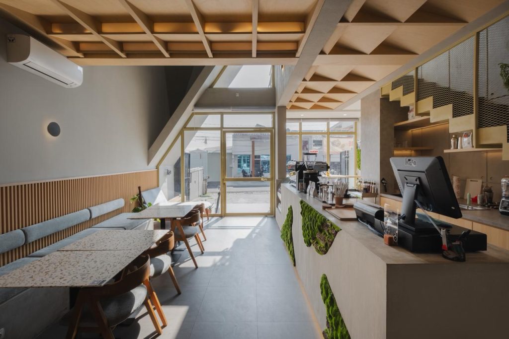 Berada di ruko tak membuat kafe ini kehilangan daya tariknya untuk dikunjungi. Delution Architect merancangnya dengan pendekatan Geometry of Warmth, menggabungkan bentuk geometris tajam (seperti segitiga), yang diterjemahkan ke dalam ruang yang nyaman, hangat, dan bersahabat bagi pengunjung.