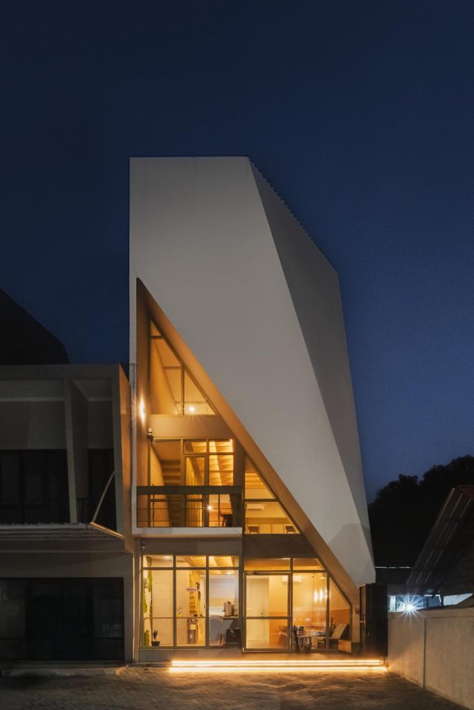 Menjawab kebutuhan tersebut, Delution merancang fasad bangunan dengan geometri segitiga yang tegas, minimalis, dan menciptakan kontras yang kuat di tengah lingkungan sekitarnya.