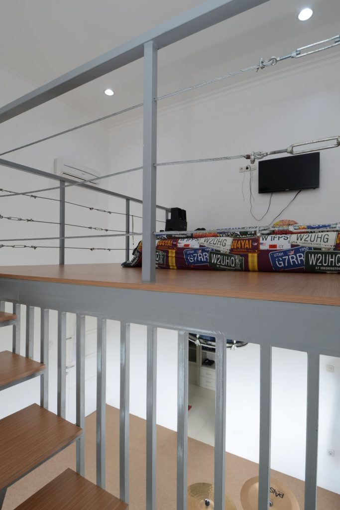 Di mana ia tidur? Dengan hanya menempatkan kasur (tanpa ranjang) di bagian atas kamar yang didesain dengan konsep LOFT ini, pemilik kamar biasa terlelap. Tak jarang, jika teman-temannya datang menginap, lantai kamar pun menjadi tempat tidur yang nyaman buat mereka.