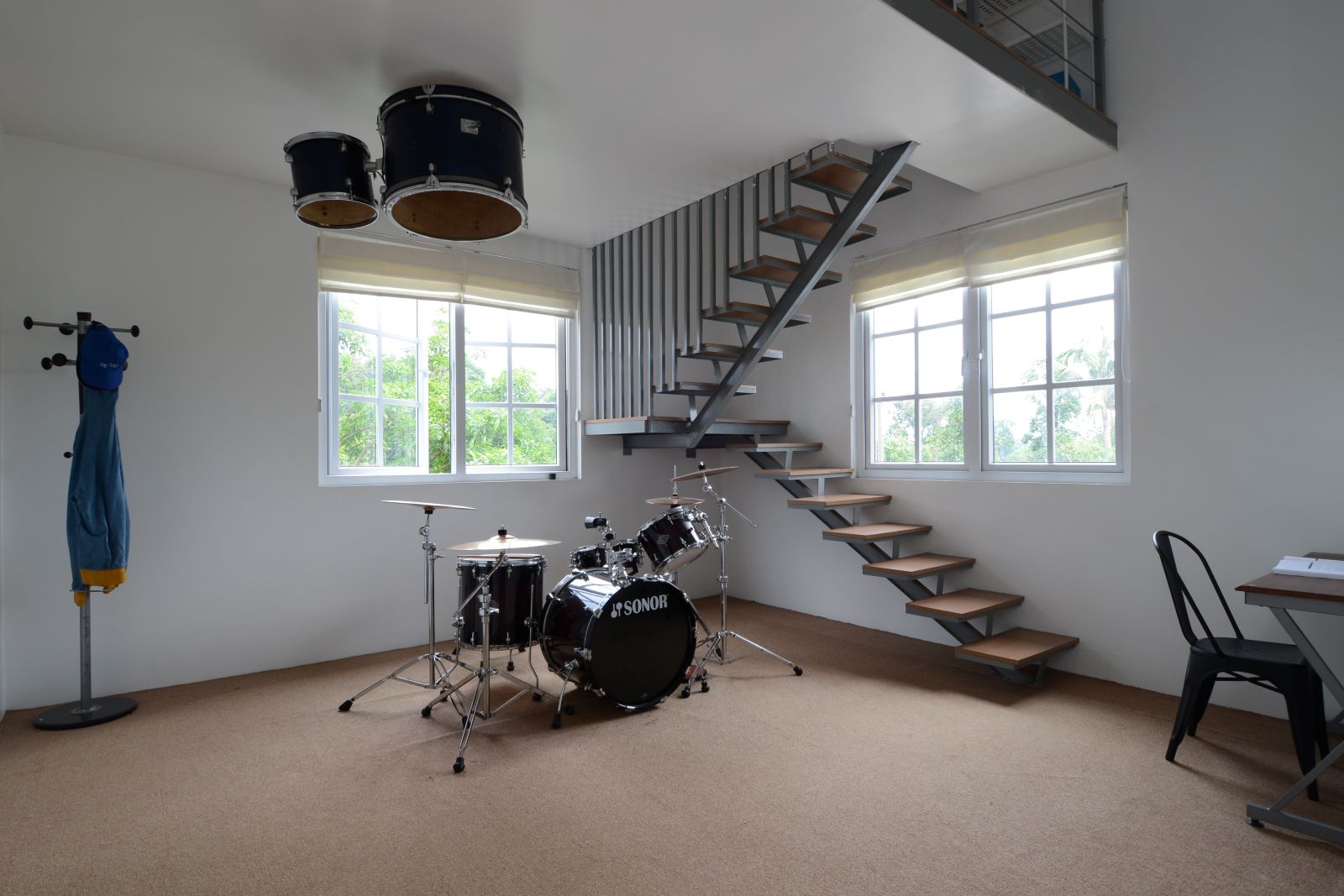 Tak hanya bermain sendiri, tak jarang teman-teman kelompok bermusiknya, datang bermain bersama di kamarnya dengan membawa alat musik mereka masing-masing. Memastikan ruangan kamar cukup untuk menampung beberapa teman musiknya, kamar ini ditata dengan membiarkan area kosong di bagian tengah dengan hanya menaruh drum sebagai isinya. Perabot lain seperti meja belajar dan rak pakaian ditempatkan di “pinggir” ruang.