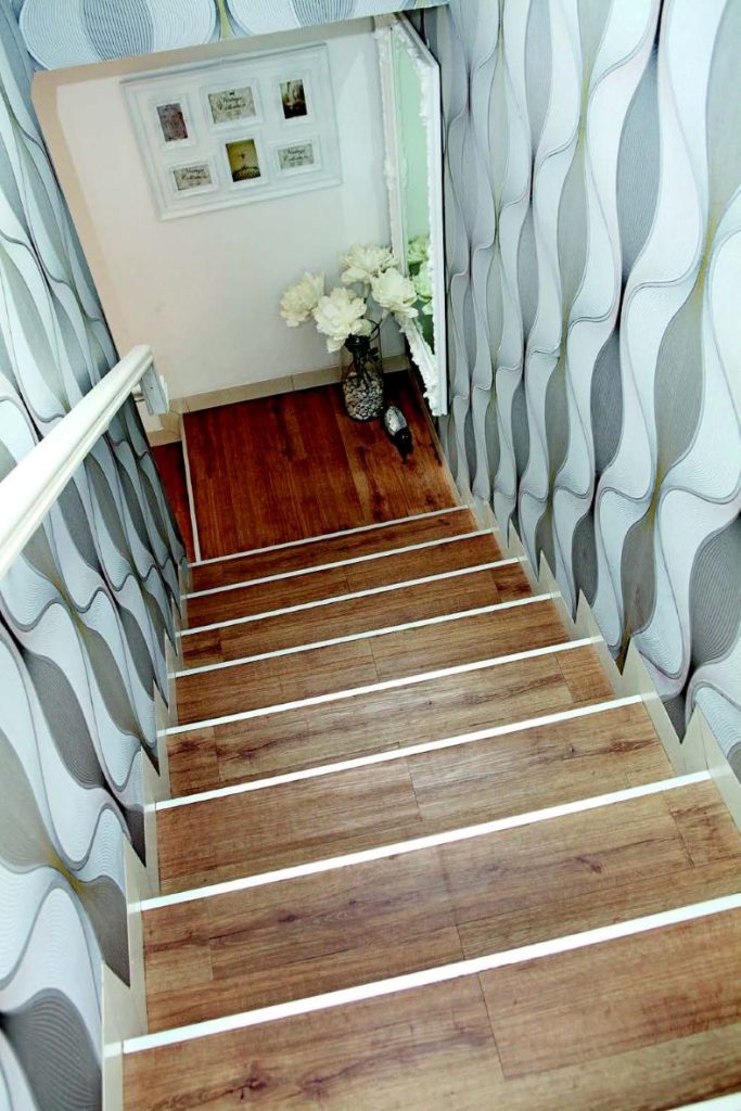 Wallpaper menjadi senjata dalam mempercantik dinding tangga kayu ini. Sementara, strip antilicin pada pijakan anak tangga, tak hanya berfungsi sebagai pengaman tetapi sekaligus mempercantik tampilan anak tangga agar tak terlihat monoton. Yang menarik, pada area bordesnya diletakkan cermin untuk berias, pajangan foto, dan aksesori berupa bunga dan patung.