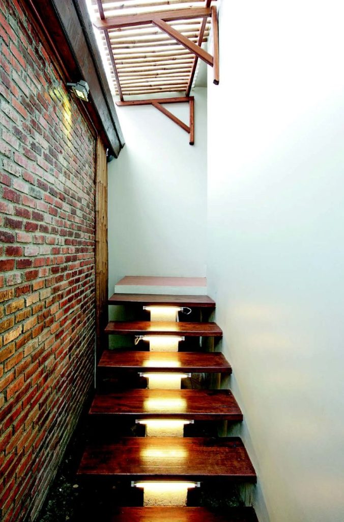 Dinidng bata ekspos memang selalu menarik untuk diaplikasikan di berbagai ruangan, tak terkecuali area tangga. Tambahkan juga lampu di bawah anak tangga sebagai penerangan sekaligus lampu dekoratif. Area tangga jadi makin cantik!
