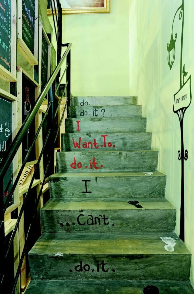 Kesan unfinished terasa kental pada area tangga ini berkat penggunaan semen ekspos. Agar semen tak dibiarkan polos begitu saja, setiap pijakannya dihias menggunakan cat kemudian ditulisi kata-kata. Dindingnya pun tak luput dari hiasan. Sebuah stiker berkarakter yang ditempel pada dinding membuat tangga terlihat atraktif.