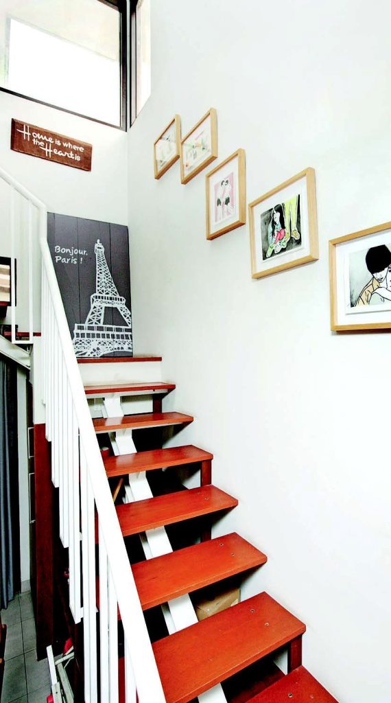 Jika kamu memiliki hobi menggambar atau membuat ilustrasi, kenapa tidak memajang karya itu di area dinding, seperti yang diterapkan di hunian ini? Pemiliknya membuat beberapa ilustrasi gambar kemudian gambar-gambar tersebut diberi pigura kayu dan diletakkan secara berjejer di area dinding tangga.