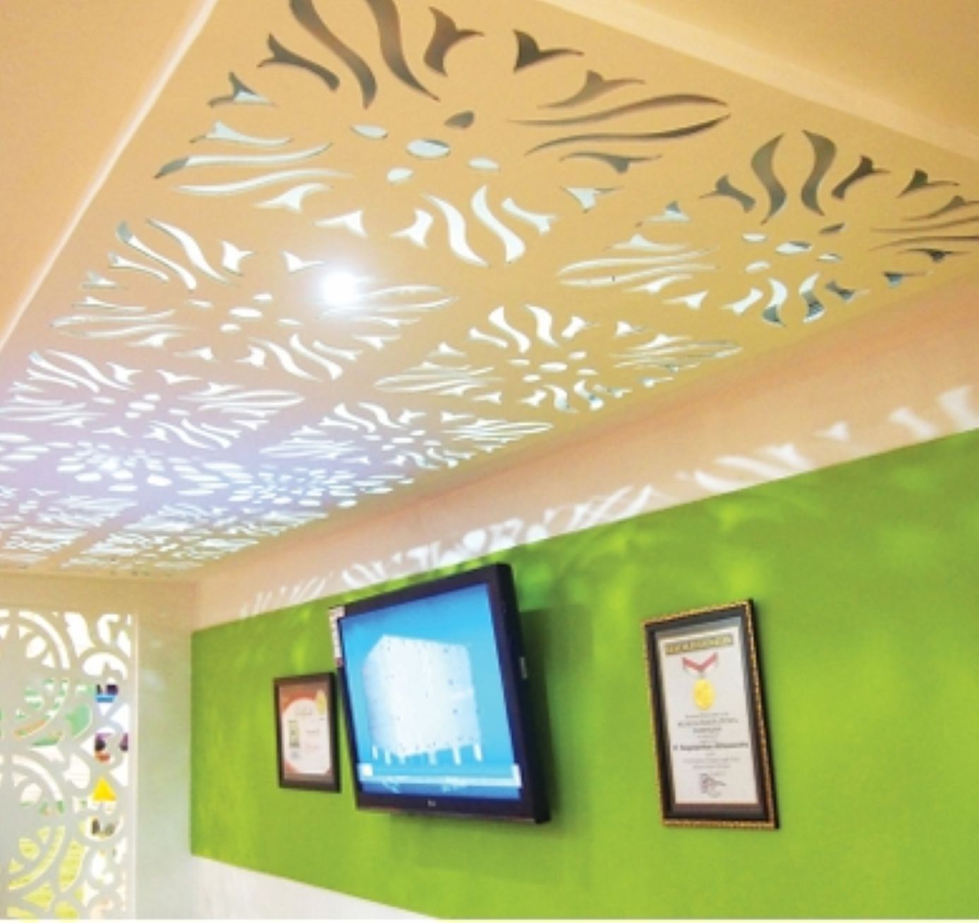 Dengan pilihan corak yang dimilikinya, kita dapat meneruskan cahaya ke dalam ruang sesuai keinginan dan selera. Untuk kesan elegan, pilih corak dengan tampilan floral yang bersulur. Cahaya yang muncul di sela-sela sulur akan menghasilkan bias yang menarik di dalam ruang. Warnai permukaan Decopanel dengan pilihan warna-warna elegan, maka paduan warna dan terang cahaya akan memunculkan tampilan sangat menarik bagi ruangan.