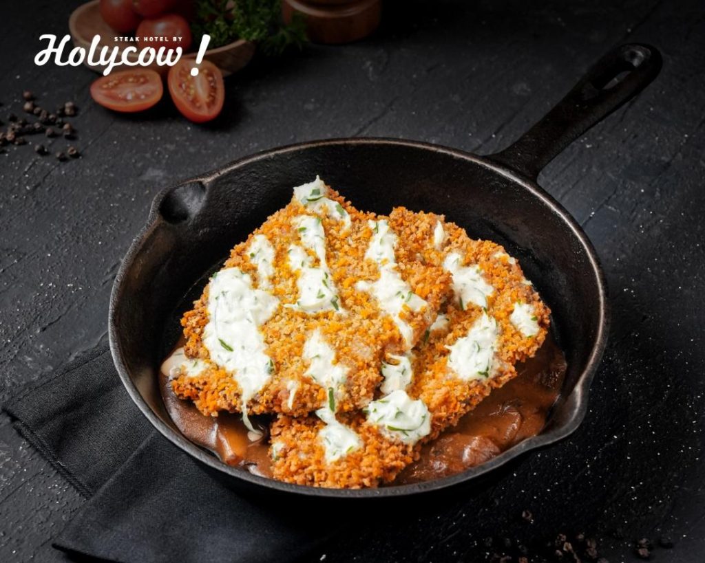 Daging sirloin 200 gram yang dibuat pipih dan dilapisi tepung roti sehingga menghasilkan tekstur cutlet empuk. Disajikan dengan Onion Gravy yang gurih serta Tzatziki Sauce, saus yogurt khas Mediterania yang creamy dan segar.
