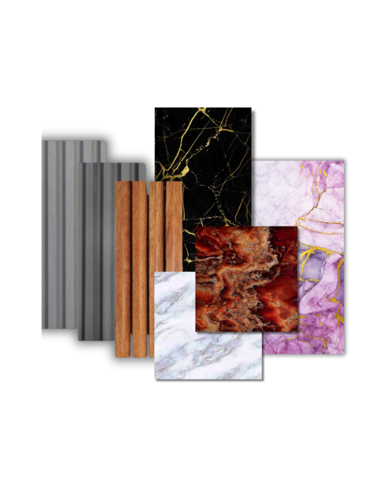 - PVC 3D Wall Panel: menonjolkan efek visual tiga dimensi untuk tampilan dinamis.