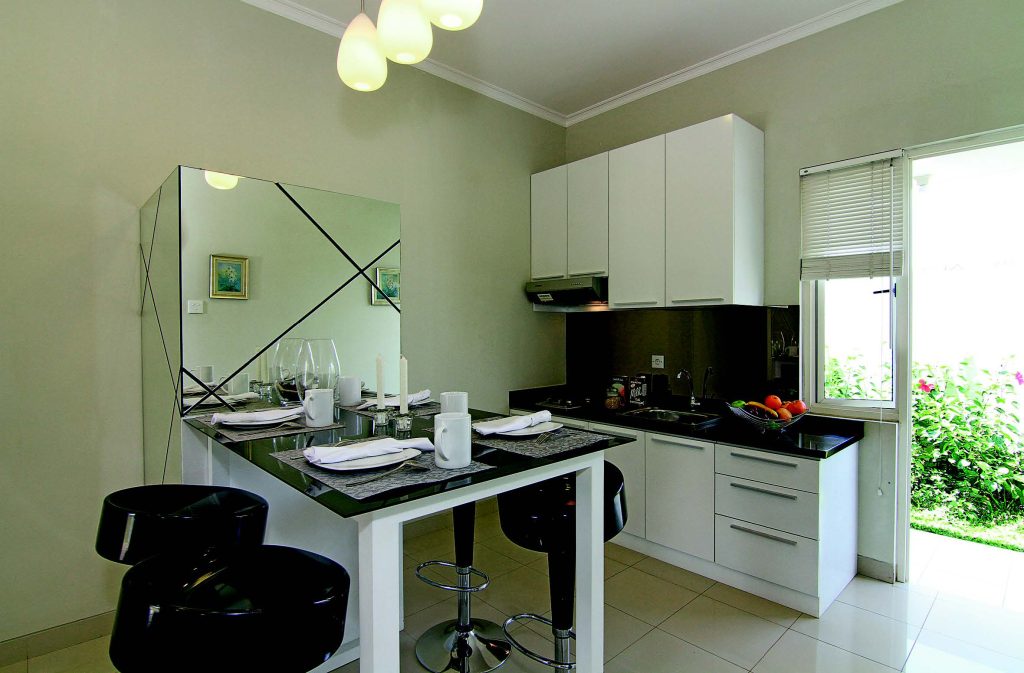 Satu hal lagi yang patut diperhatikan pada penataan rumah mungil adalah keberadaan dapur dan meja makan, Karena sangat mungil, rneja makan tidak perlu terlalu besar.