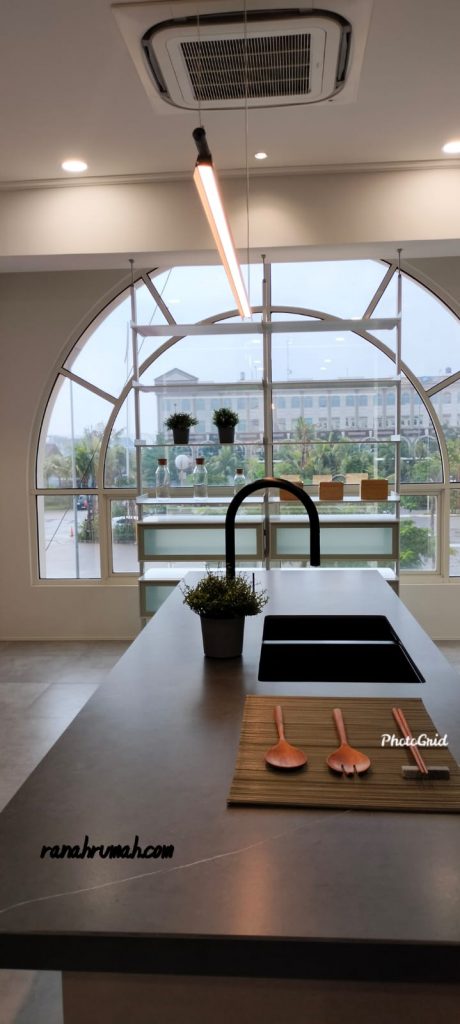 Menggabungkan fungsi dan keindahan, berbagai produk desain interior dapur, wastafel, panel TV, dan rak yang multifungsi sebagai partisi, serta pintu, hadir di showroom 2 lantai ini.