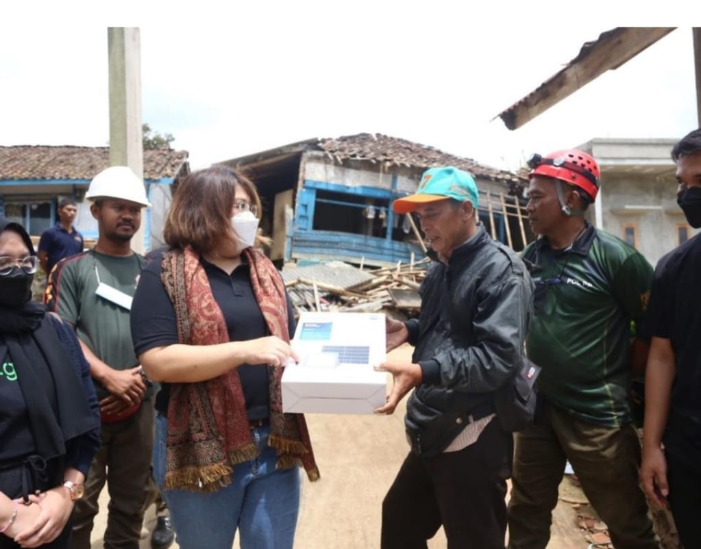 Lea Kartika Indra dan tim menyerahkan Philips Essential SmartBright Solar Flood Light kepada warga di Kecamatan Cugenang Cianjur (Dok. Signify)