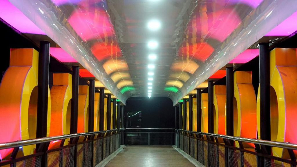 Dengan pencahayaan baru yang dipasang, jembatan penyeberangan menjadi lebih terang dan lebih berwarna, sehingga membantu mengubah persepsi tersebut.