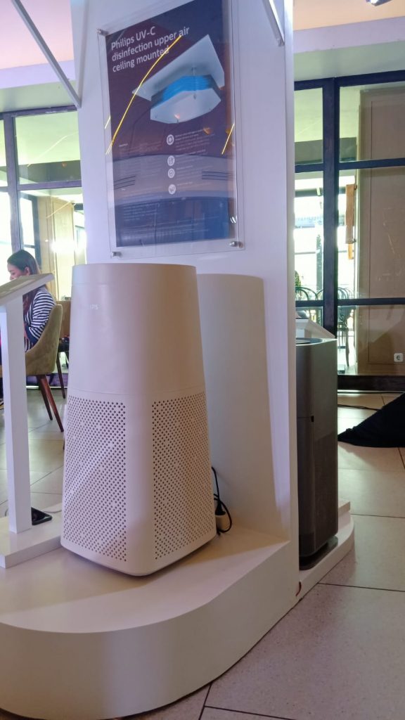 Selain itu, Philips UV-C Disinfection Air Unit dirancang untuk desinfeksi udara dengan desain portabel di lantai yang dapat mendesinfeksi hingga 90% mikroorganisme dalam ruangan seluas 80m3 hanya dalam 2 jam dan memiliki cakupan sirkulasi 28m3 .